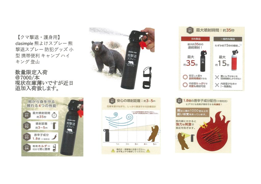 山歩き、山菜採りがお好きな方に「熊よけスプレー」をご紹介いたします。お値段はスプレーってこんな値段!!と思ってしまうところもありますが、被害を未然に又は最小限に防ぐことを考えると心強いアイテムのひとつだと思います」。是非この機会にお求め下さい。