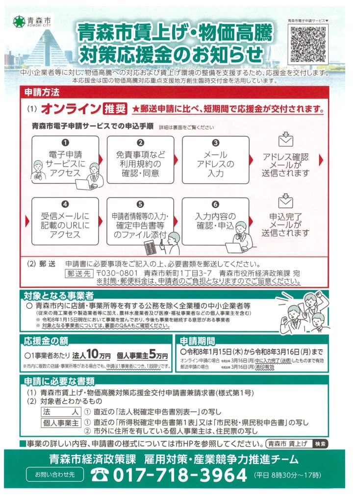2026年1月16日 / 最終更新日 : 2026年1月16日 sakaikenzai 新着情報 ご存知ですか? 青森市賃上げ・物価高騰対策応援金のお知らせ 青森市では、中小企業者等に対し、物価高騰への対応および賃上げ環境の整備を支援するため応援金を交付します。 申請期間は令和8年1月15日(木)~令和8年3月16日(月)までです。 当社、経理部では早速15日に電子申請しました申請方法はとても簡単でした。 詳しくは青森市HPをご覧ください。 令和7年度青森市賃上げ・物価高騰対策応援金
